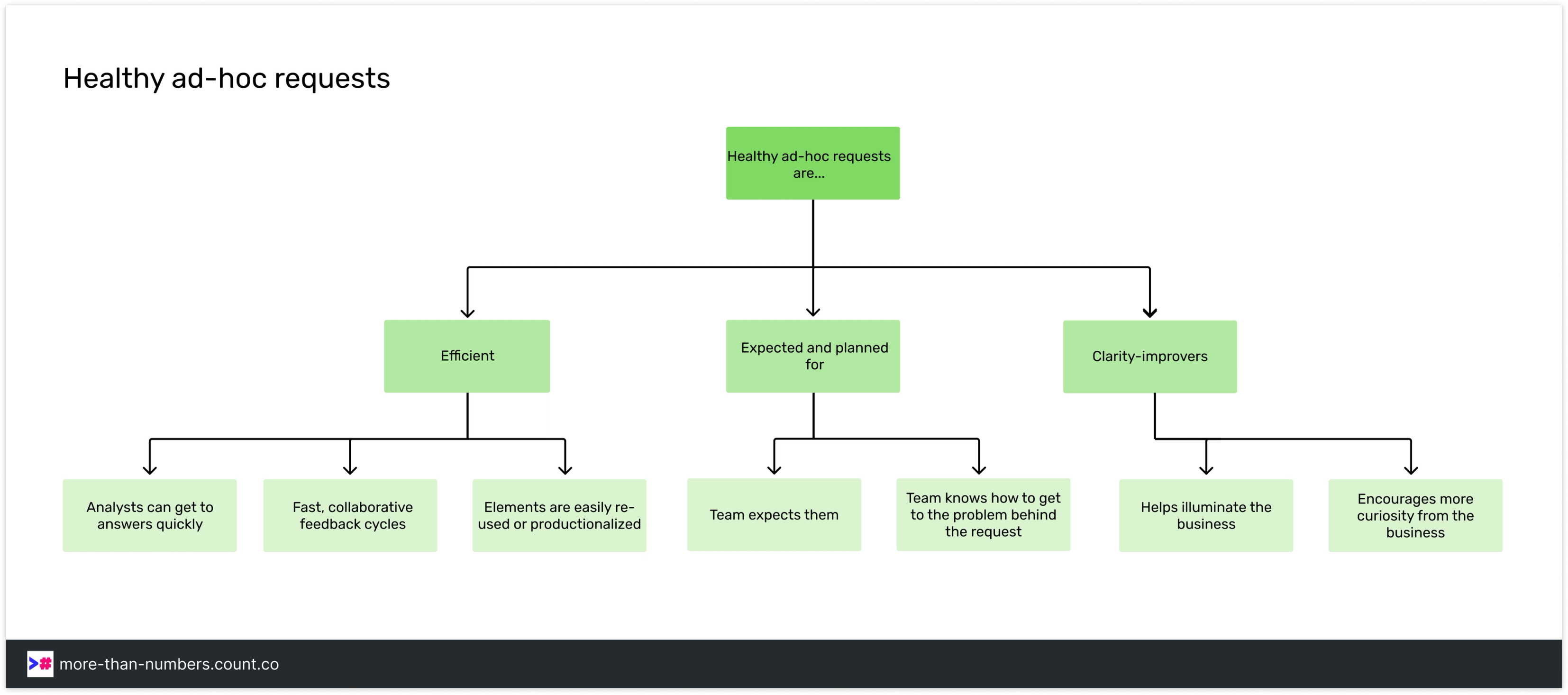 In contrast, healthy ad-hoc can feel oddly...good. When you get a request from the business, you can usually anticipate why they're asking - what hypothesis they have that can crack the big problems you helped them identify. You are brought into their problem-solving, helping each other come up with new theories to test and lines of thinking to explore. Your time spent doing this is often more valuable than the time spent building another report or answering a vague data request. These are the days we love most in data.