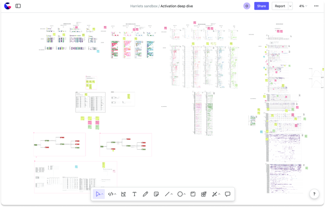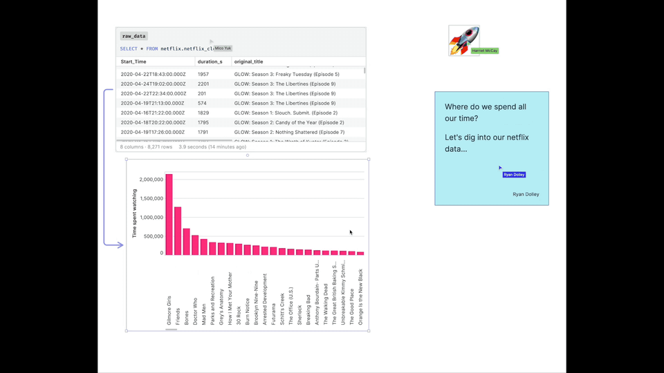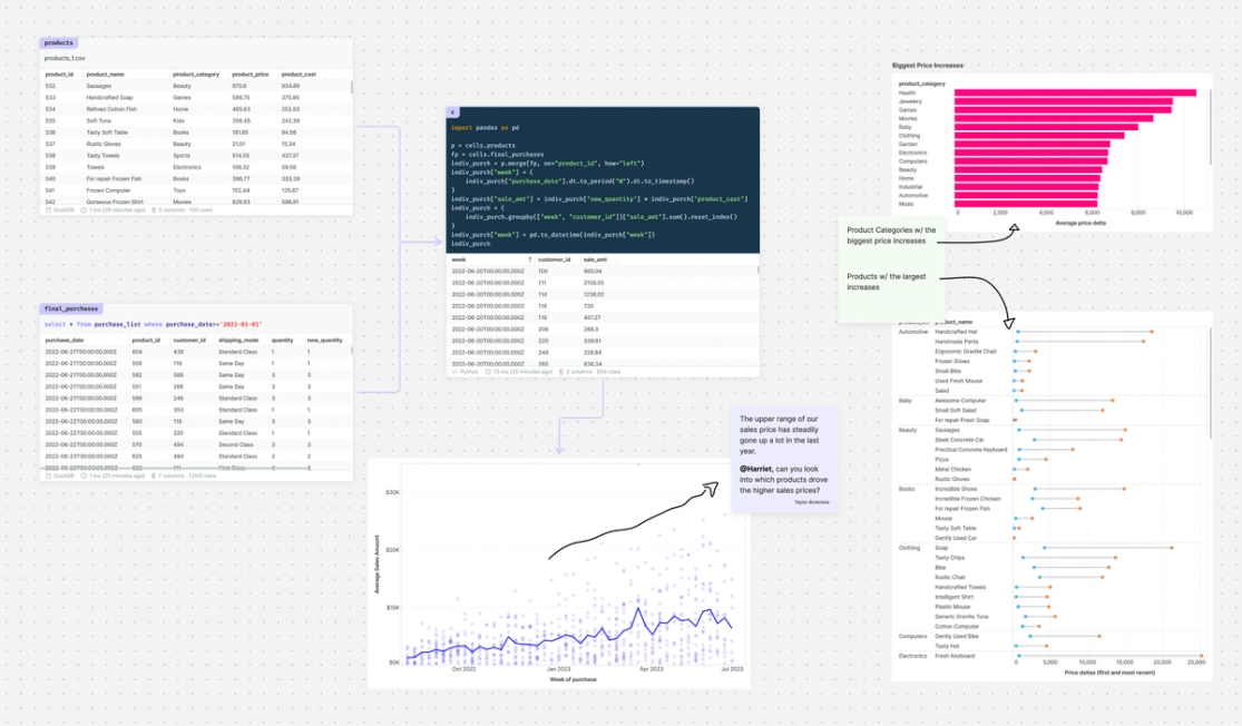 2. Collaborate with more than just the data team. Stakeholders are already used to Miro and Figjam so the canvas feels far more familiar and welcoming to them than a traditional notebook interface. And since your cells are laid out spatially (not linearly), with sticky notes, your work is surprisingly easy to follow, even for less technical users.