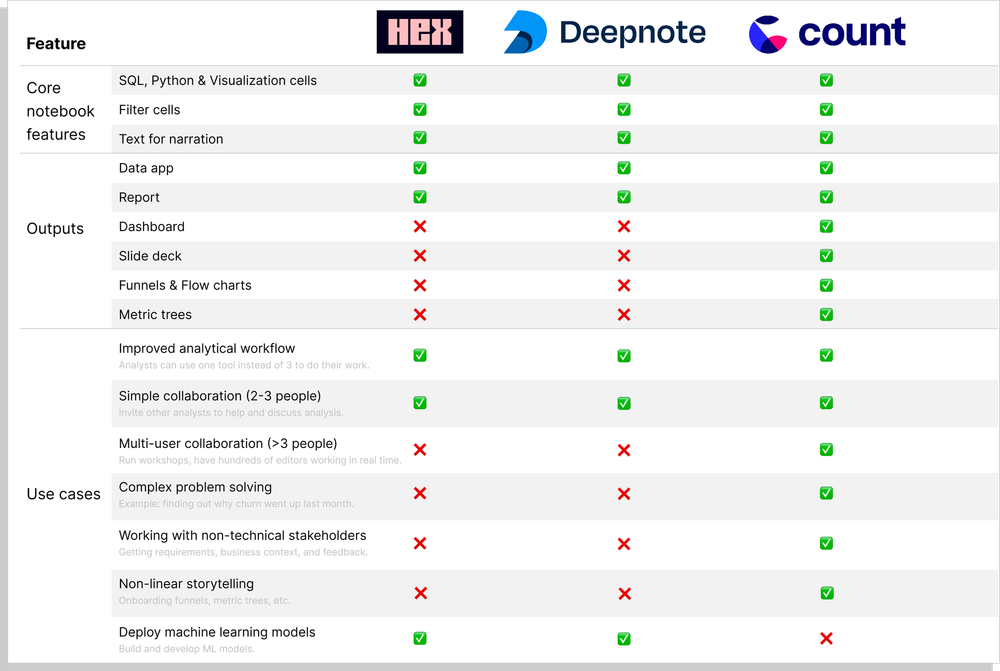 Below is a summary of the features offered, and use cases supported by Hex, Deepnote, and Count.