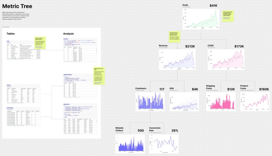 4. An unexpected use case: data modeling.In the years since releasing the canvas, we’ve been surprised to see the number of people using it for data modeling. The spatial layout pairs well with the DAG approach to data models, and in the canvas, it becomes easier than ever to work on models with stakeholders and fellow analytics engineers.