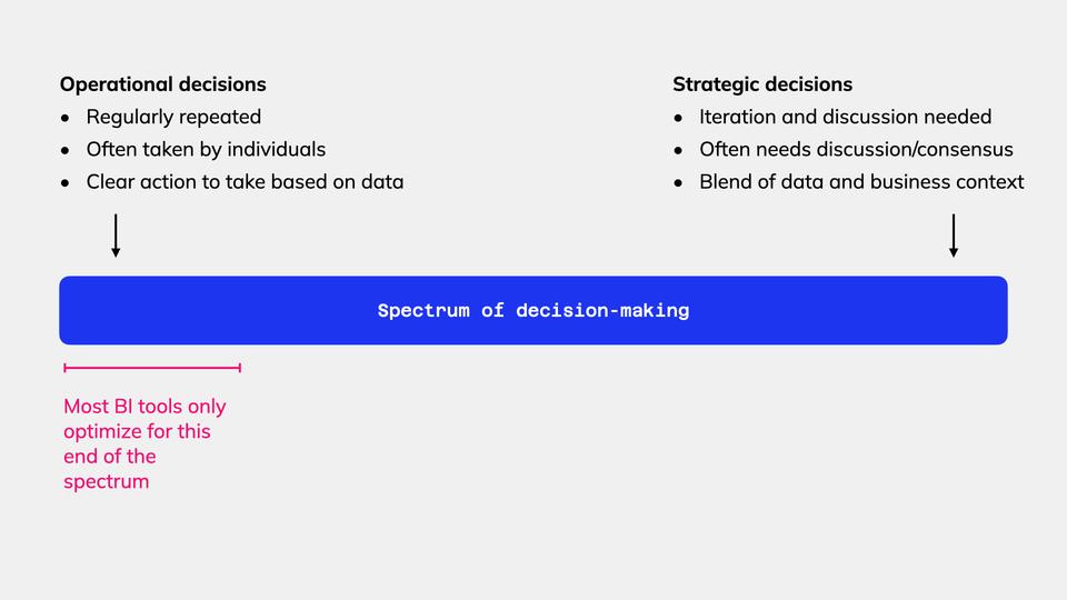 When the decision is complex or cuts across teams and functions, dashboards are no longer sufficient. These decisions need a tool which supports not just data but the wider workflow via collaboration, easy iteration, and discussion—and the combination of data and qualitative information.