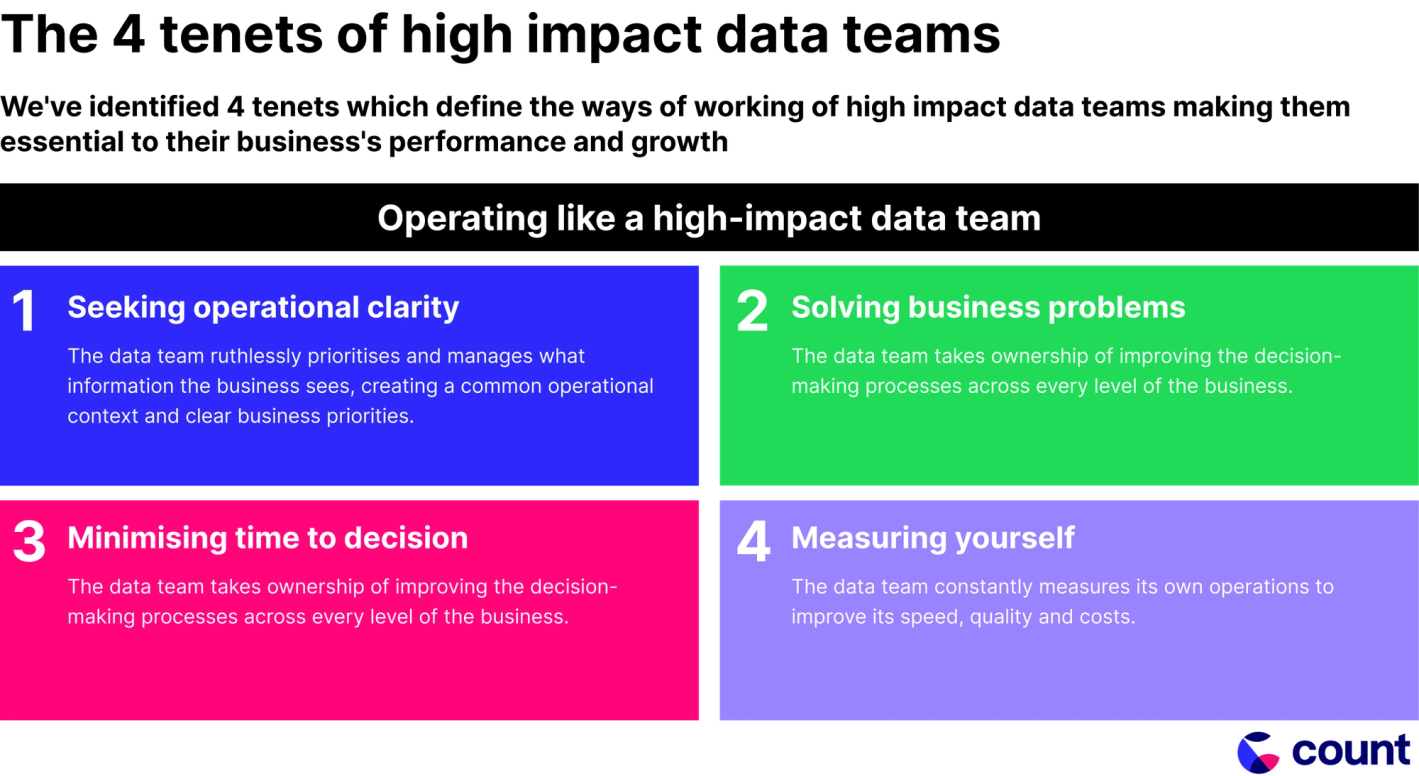 The final result of these conversations and reflections are the following for tenets for high-impact data teams: