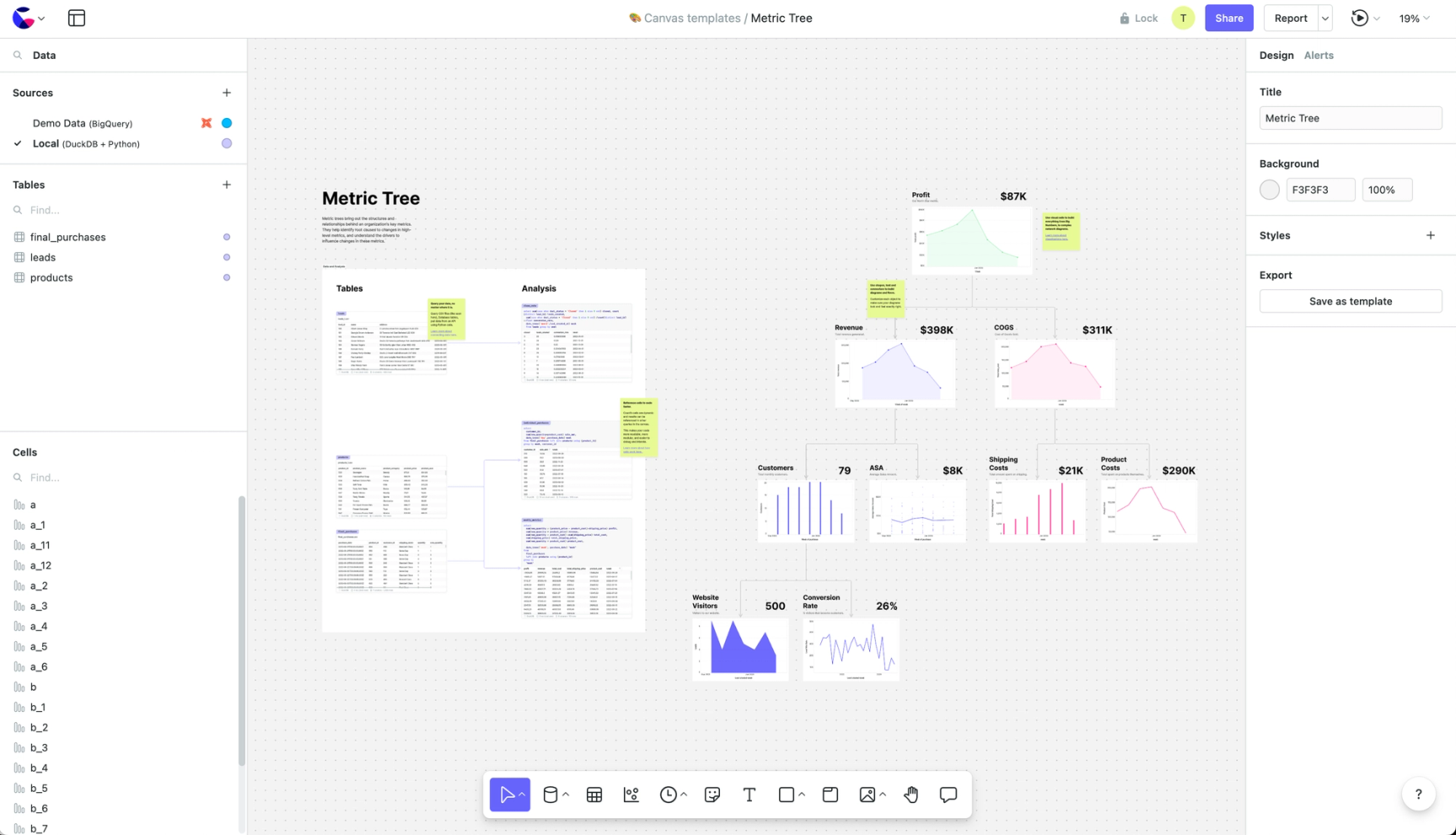 Count is a combination of a whiteboarding tool, BI tool, and SQL IDE, making it ideal for building metric trees, and indeed, metric trees are one of the most popular use cases for our customers. You can use the whiteboard to map out your tree with stakeholders, agree to definitions, and then start adding data from your database or tool of choice. You have the ultimate flexibility to build any kind of tree you want, and when it’s live you still have all the flexibility to explore those trees.