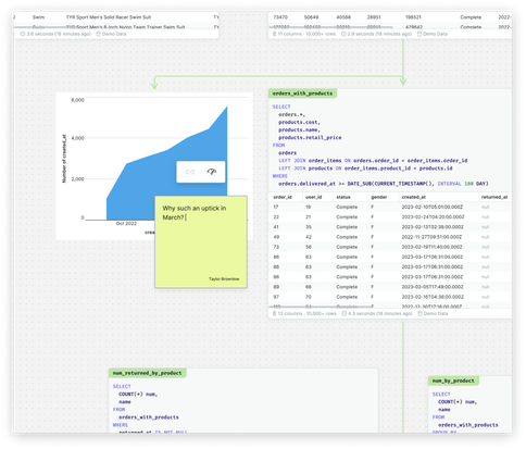One of the key features of Count from day one has been the ability to chain queries together through cells. This allowed us to build up complex pieces of logic step-by-step in the canvas, all the while making sure it was annotated and easy for others to follow.
