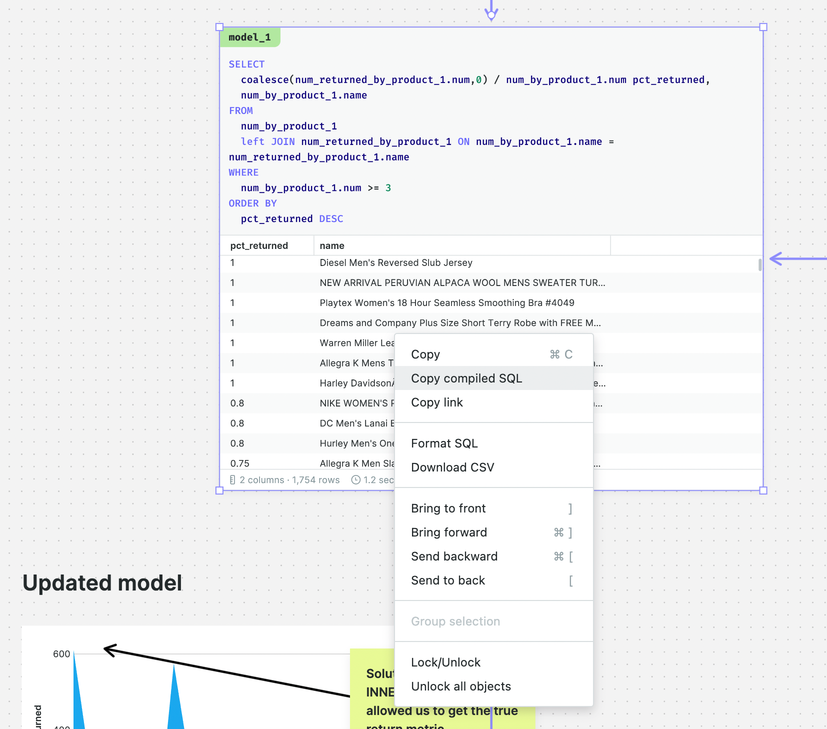 And, of course, should you need to export your new complex SQL query back into your data modeling tool, or code management tool, you can always copy the full, compiled SQL of any cell back out: