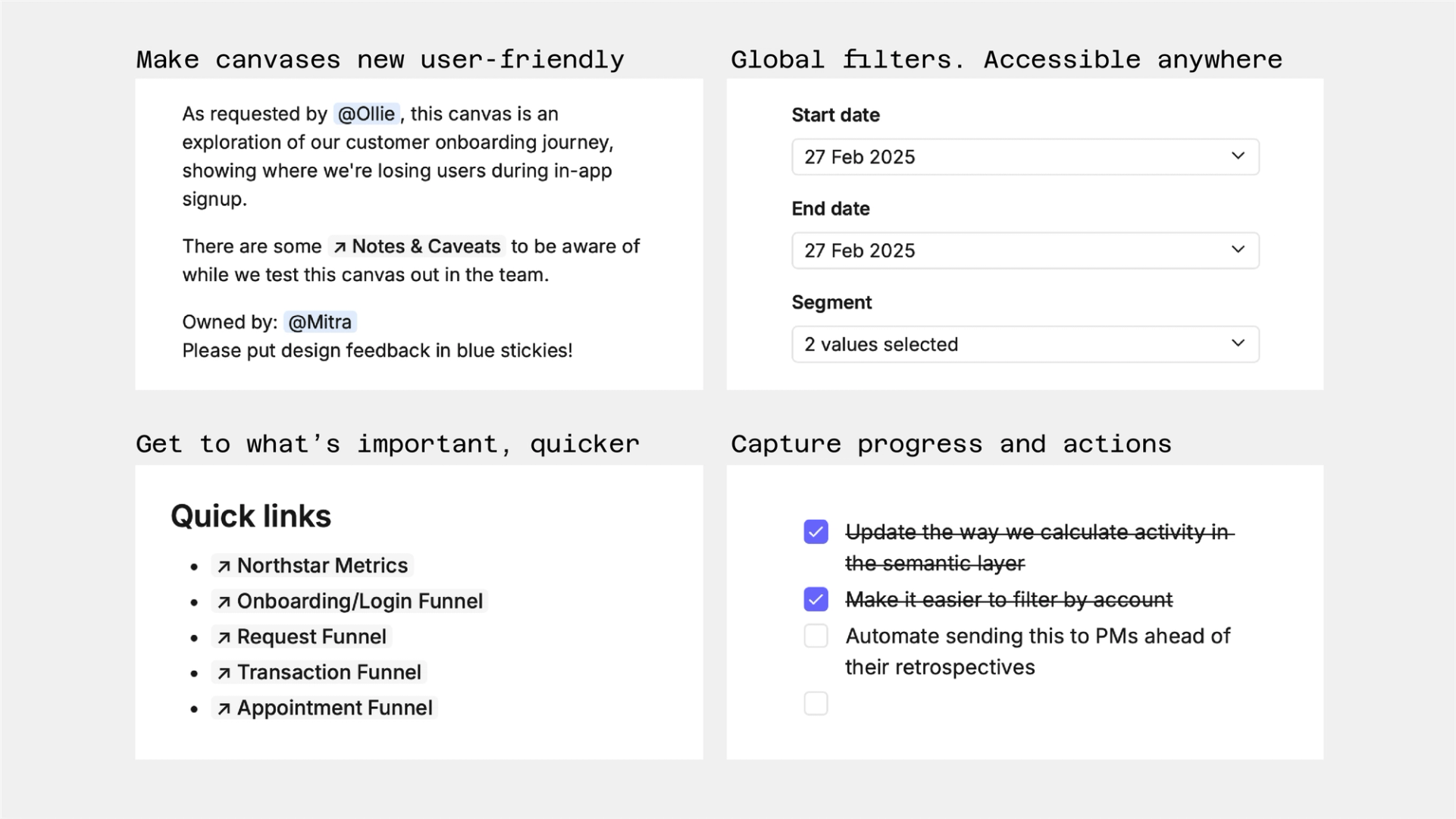We're busy at work rolling these out across both our own internal canvases, andour public gallery of examples. Yes, we too will miss those awkward little intro boxes we never quite worked out how to style, but overviews nudge you to create better, more accessible, and more immediately useful work.