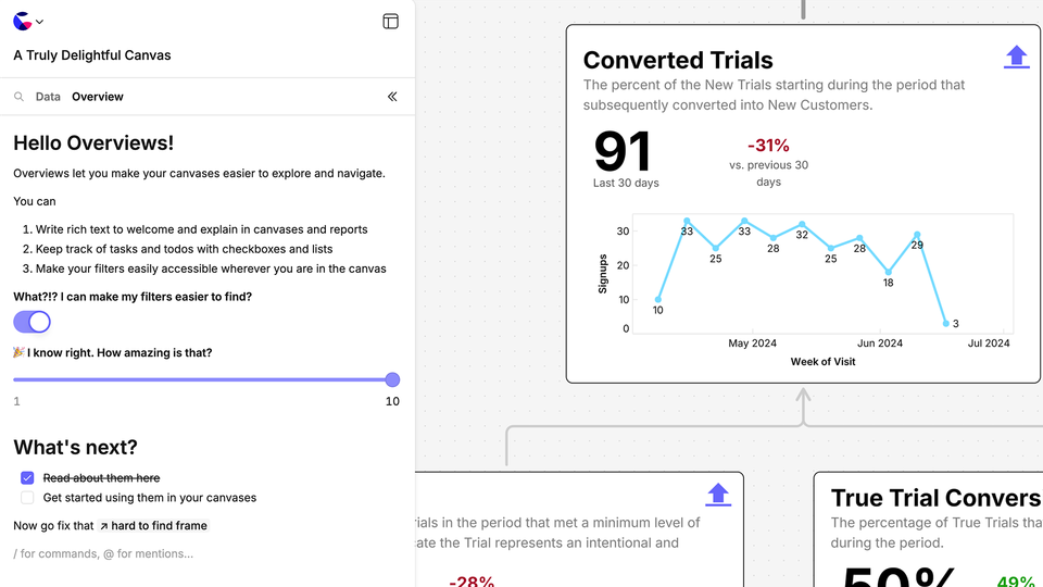 So, we're delighted to introduce Overviews—our way of documenting and elevating canvases so that they drive better engagement and exploration of data and business alike. You'll find them in the left-side panel on all your canvases starting today.