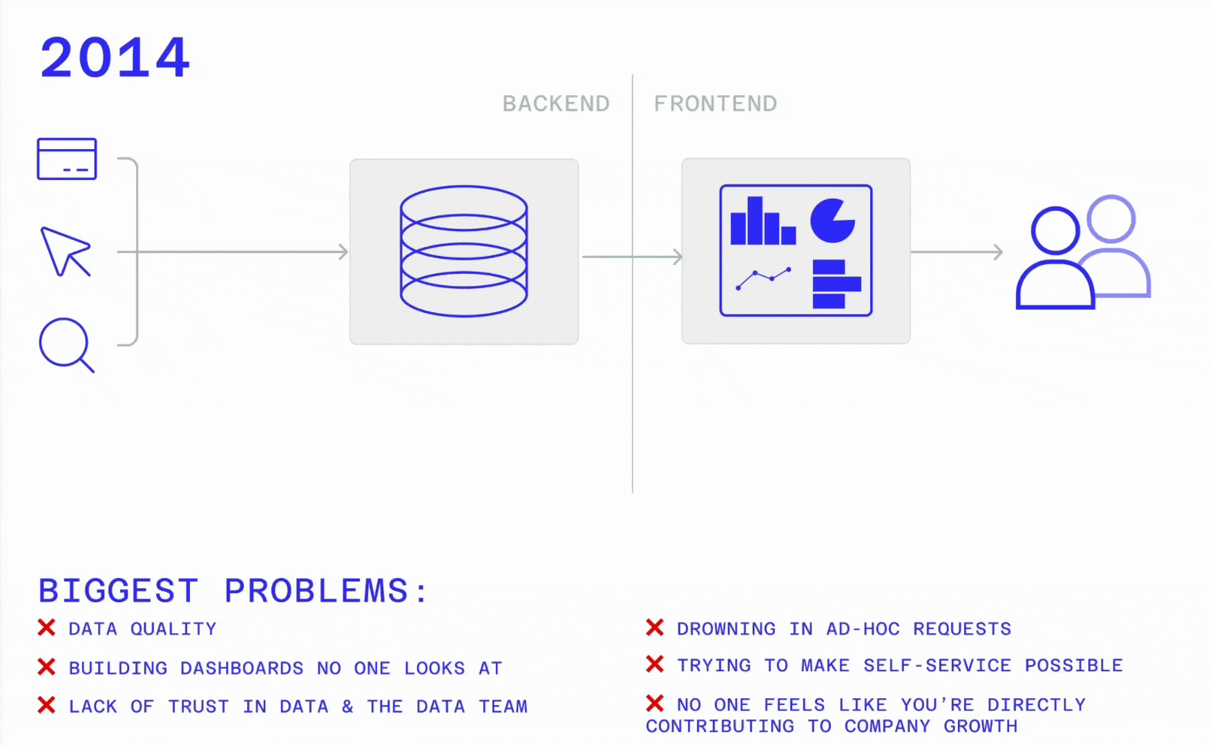 In the last 10 years we've seen a flurry of new tools, but the overwhelming majority of these affect our back-end systems. The way we provide data to the business—through BI tools like Looker and Tableau—remains basically unchanged.