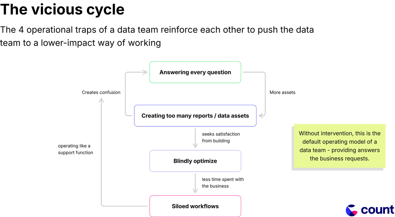 When caught in this loop, data teams become “dashboard factories,” valued only for accuracy and speed. Their interactions with the business become transactional and strained.