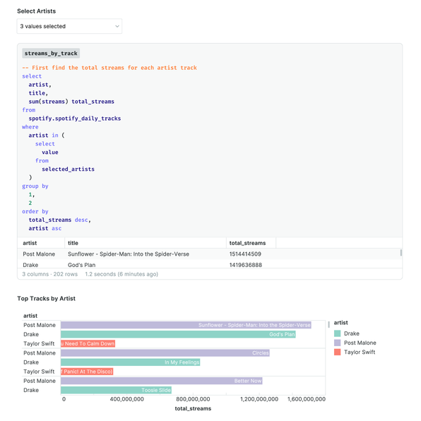 Example: If I wanted to find the top tracks for three popular artists: Drake, T Swift, and Post Malone, I could use the rank function, partitioned by artist, and ordered by streams to calculate the rank of each track.
