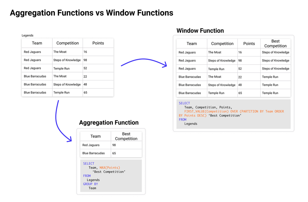 In contrast, by using a window function we can quickly find the best event for each team. Let's break down how that worked.