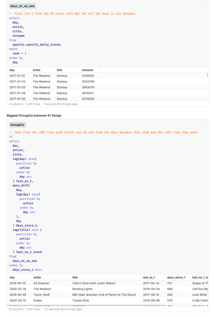 Example: I wanted to find the biggest droughts for Spotify artists between their #1 hits. To do that I: