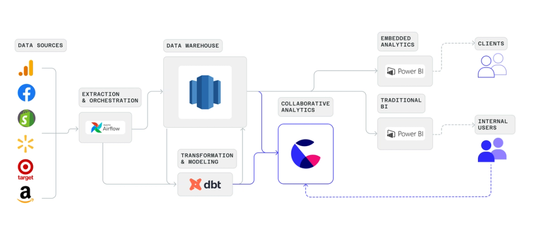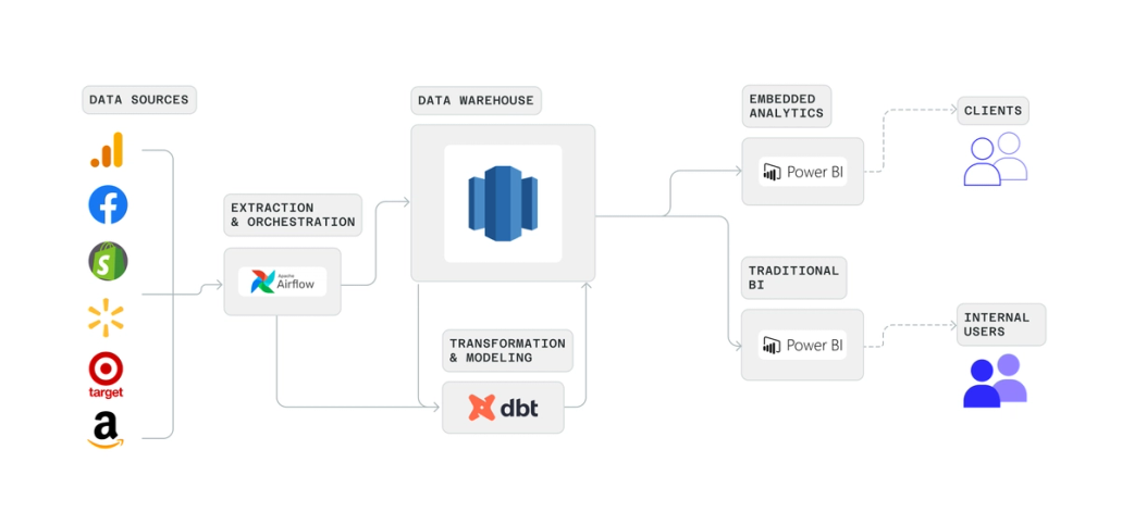 The Stable, part of Accenture, helps brands build digital commerce channels and understand their performance across various retailers. For Justin’s team, this requires maintaining a complex pipeline of data. Data is sourced from a variety of retail (e.g. Walmart, Target, Amazon, Shopify) and media (e.g. Facebook, Google Analytics) sources, then merged, transformed, and presented as internal reports, and shared with clients via an embedded analytics platform.